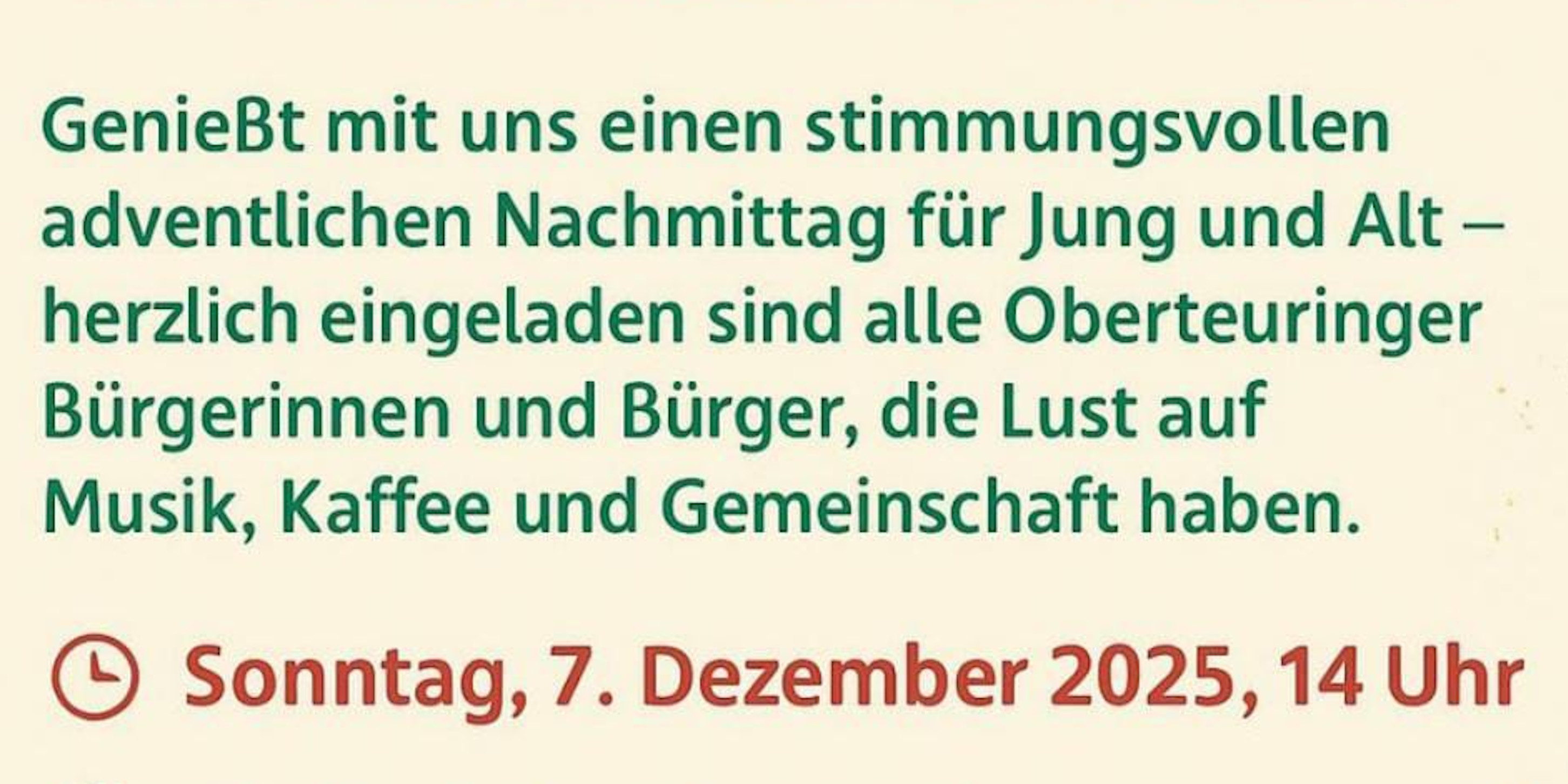 Genießt mit uns einen stimmungsvollen adventlichen Nachmittag für Jung and Alt - herzlich eingeladen sind alle Oberteuringer Bürgerinnen und Bürger, die Lust auf Musik, Kaffee und Gemeinschaft haben.