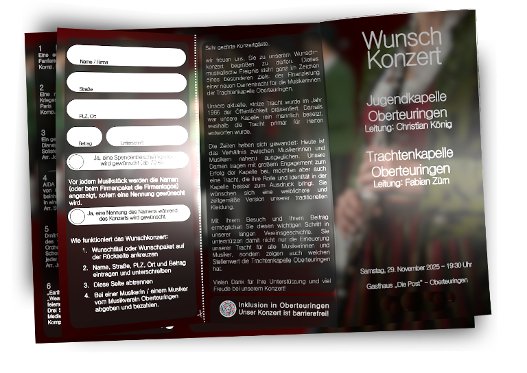 Auf unserem Programmheft, das bei jeder Musikerin und Musiker erhältlich ist, können alle Wunschtitel ausgewählt und eingetragen werden. Die Namen der Wünschenden werden vor jedem Titel auf auf Leinwand projiziert. Jedes Programmheft berechtigt zum Eintritt für eine Person.